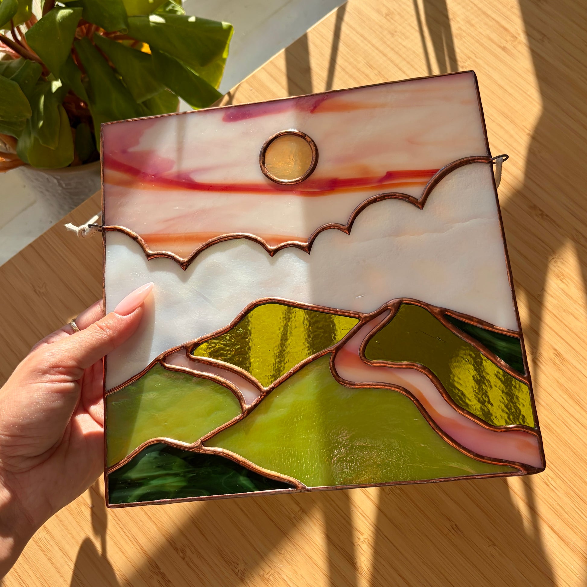 This stained glass panel is made with 11 pieces of hand cut glass, copper foil and held together with solder. Finished with copper patina. Polished and ready to hang on wax cord with 5" of drop length.